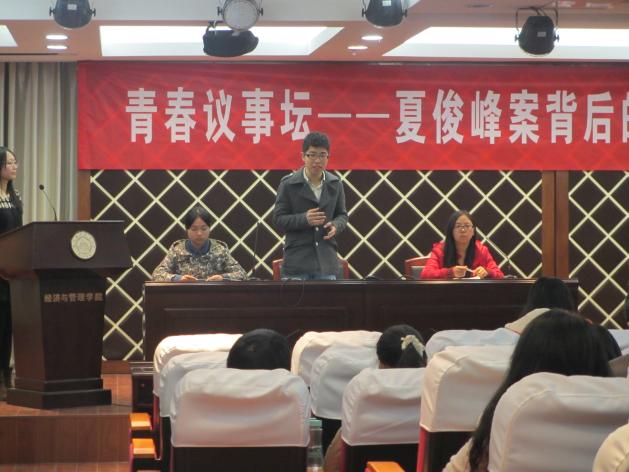 11月21日,中文成人网 主办的青春议事坛活动在经管大楼A0305火热开幕,此次活动以“夏俊峰案背后的经济与管理‘凶手’”为主题,六名评论员各抒己见,展开了激烈的讨论。中文成人网 经济系的陈圻教授,工商管理系的张浩副教授、王子龙副教授以及2012级辅导员刘旭出席了此次活动。