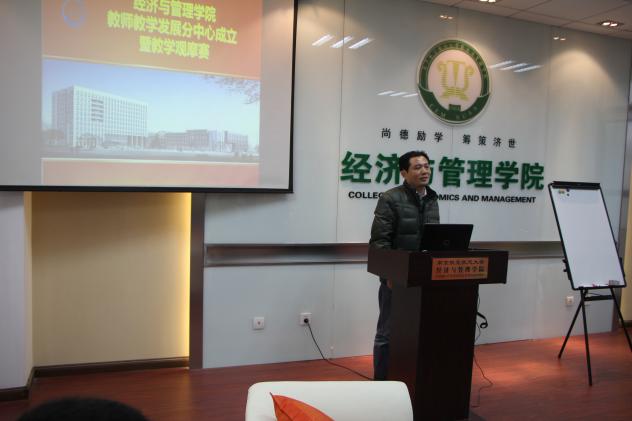 周德群院长阐述了教师教学发展分中心的成立背景,指出教师教学发展中心是教师“分享、交流和提升”的平台,主要目标是致力于帮助教师教学力的跃升。他结合学院2014年的工作目标,对分中心的任务提出了设想。高教研究所和教务处领导对经管分中心的成立表示祝贺,并表示将为分中心的机制和模式研究提供支持。