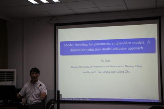 接着,活动主持人虞先玉老师介绍了本次活动主讲人郭旭老师的学术背景和研究成果。郭旭老师首先介绍了自己的个人基本情况以及近期做的一些科研工作。郭旭老师近期和王建立老师的博士生导师李静远老师合作的一篇文章已经基本被Insurance: Mathematics and Economics接受(Conditional Accept)。郭老师对此非常感谢学院经常进行的学术交流,使得他有机会和王建立老师以及李静远老师进行学术合作。郭老师对模型检验进行了介绍,并分享了其研究过程中的启发和感悟。汇报结束后,朱建军、王英副院长,周鹏教授,宋连莲老师,虞先玉老师、蒋昕嘉老师和郭旭老师就学术研究以及一些统计学的概念进行了交流讨论。整个报告会中,参会的老师们都积极参与学术交流,会场气氛轻松活跃。