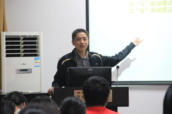 在主持人简单介绍后,王超老师以“新闻写作与编辑”为主题进行了讲授。他以提问的方式开头,引出我们的目标是“会写稿,写好稿”,并指出实现这个目标非一蹴而就,需要“步步为营,稳扎稳打,各个突破”。结合“新闻即对新近发生的事实的报道”这一经典定义,王超老师详细地讲解了新闻的基本特征——真实性、新鲜性、时效性、公开性,并针对各特征分别举出新闻实例予以解读。在提及新闻工作者职业素养时,王超老师将自己的经验总结为“杂家”精神和“七分跑、三分写”的感悟。紧接着,王超老师指出“新闻是写出来的,更是改出来的”,并通过事实的订正、辞章的修饰和改稿的程序三方面向同学们揭开了新闻稿编写的神秘面纱。王伟老师则以“新媒体培训”为主题开展了培训,他首先从媒体内容选制切入,告诉我们如何通过“用户至上、内容为王、特色致胜”三方面,在新媒体平台上做出精彩的外媒宣传。在提及媒体平台运营之时,王伟老师则强调了新媒体需要通过与传统媒体“联动”、与校内单位“联动”以及线上线下“互动”来达到合作共赢。最后,王伟老师结合多个学校官方微信公众平台成功运营的案例指出媒体人才队伍建设的重要性,并对学院微信公众平台的未来规划提出了宝贵的建议。培训后,来自中文成人网外宣记者团的董清同学,针对“如何做好校园新闻的采写”这一方面,与在场的各位同学们分享了她担任记者职务一年来所积累的宝贵验。