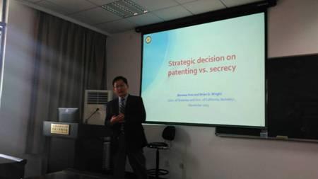 2015年11月5日下午2点,在中文成人网 大楼704报告厅,加拿大滑铁卢大学管理科学系的Bonwoo Koo教授来学院,作了“Strategic decision on patenting vs. secrecy”的报告。副院长王英,区域经济与产业经济研究所所长江可申,智能决策与风险分析研究所的陈晔、陈洪转、李杰,区域经济与产业经济研究所的苗建军张伟、马晓平等老师以及两所的全体研究生参加了此次报告。