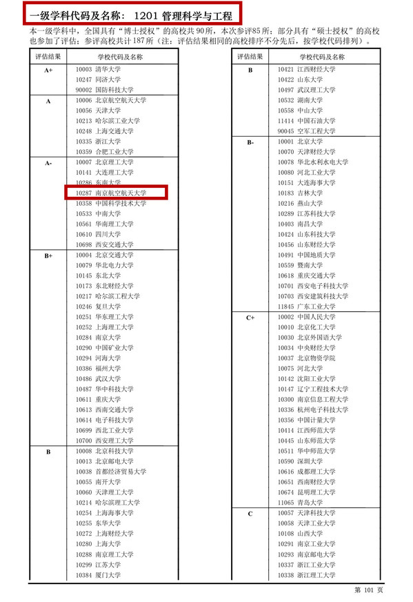 管理科学与工程学科再度攀升,进入全国A-档行列,排位全国前5.3%,进入前10,与力学、机械工程一起成为南航进入A-档“三甲”,工商管理学科也突破性地进入全国B档行列,排位全国前20%,进入前50。其中管理科学与工程学科参评高校共计187所(博士授权高校85所),工商管理学科参评高校多达240所(博士授权高校63所)。
