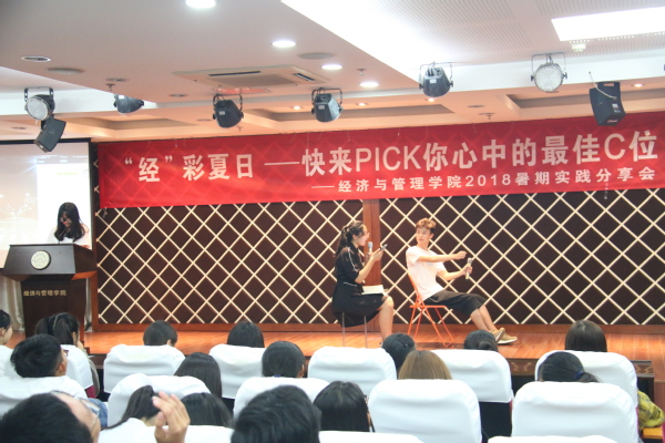 为了让同学们深入了解社会实践,学院举办了“再走实践路,重温我们的精彩”主题展览:楼梯间的手绘T恤、老照片等实践成果,激发了新生对暑期实践的兴趣。本次分享会围绕“传承之红”、“青春之蓝”、“公益之绿”三个篇章展开,小型话剧、诗朗诵、情景再现、主题演讲等丰富多彩的形式,为同学展现出经管学子在暑期社会实践大舞台上的风采。分享会还首次采用了现场投票方式评选出优秀团队,现场高潮迭起、互动紧密。