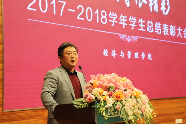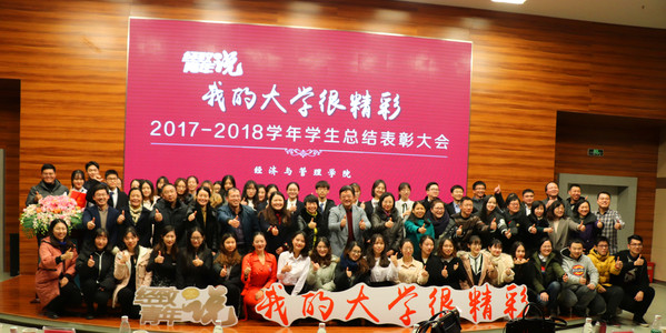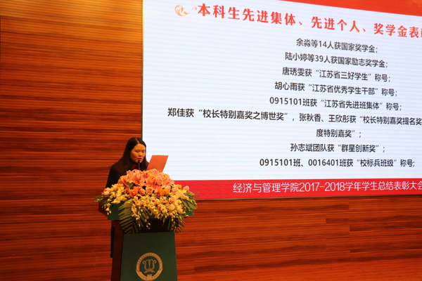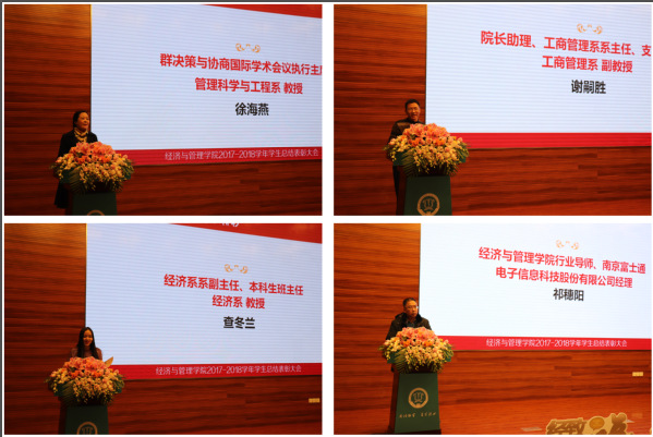 12月28日晚,“我的大学很精彩”经致青年说暨2017-2018学年中文成人网 学生总结表彰大会在将军路校区主楼四楼报告厅隆重举行。学院院长周德群,学院党委书记焦宏图,校团委书记李君,副院长王英、邓晶,党委副书记涂志宏,南京富士通电子科技股份有限公司生产制造部部长祁穗阳,经管红石榴工作坊指导老师玛依拉,各系主任、副主任,团委书记,各年级辅导员以及四百余名经管学子参加此次大会。