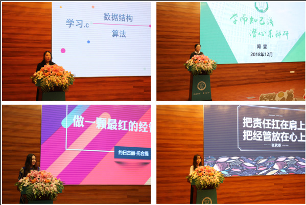接下来,学院优秀学生代表们分享了他们一年来的成长与体会。国家励志奖学金获得者、报送北京大学的王雅迪从她刻苦勤学,奋发向上的个人经历出发,强调了坚持不懈、勇于挑战的重要性;研究生国家奖学金获得者闻雯结合自己在科研上的经验,与我们分享了潜心钻研所带给她的探索新知之趣;校园丁励志一等奖学金获得者约日古丽·托合提讲述了她作为一名少数民族学生,在差异中选择包容,在多样中传承文化的励志故事;校长特别嘉奖提名奖获得者、院学生会主席张秋香回顾了这一年向同学传递温暖和希望的点点滴滴,展现了学生骨干把经管放在心上的责任与担当。