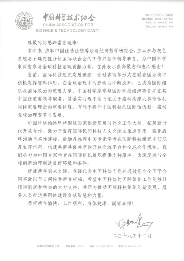 刘思峰教授收到怀进鹏主席来信后随即向中文成人网 灰色系统研究所的师生以及中国优选法统筹法与经济数学研究所灰色系统专业委员会的全体会员、灰色系统与不确定性分析国际联合会的部分会员转达了怀进鹏主席的关怀和问候。刘老师认为:怀进鹏主席来信对我国乃至世界各国从事灰色系统与不确定性分析研究的学者无疑是巨大的鼓舞,必将对灰色系统理论的发展和传播起到不可估量的推动作用!希望通过长期持续的辛勤工作,把中国本土原创的灰色系统理论火种撒向全世界。