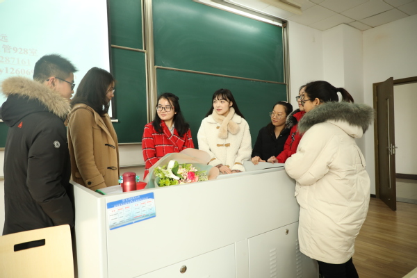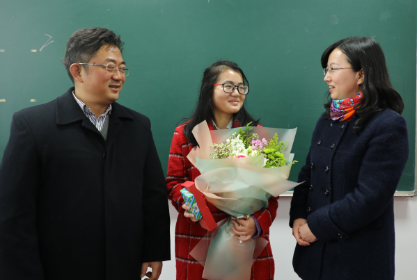 焦宏图为马永远老师送上了学院精心准备的“金嗓子喉宝”和“经管定制优盘”,她叮咛马老师初上讲堂要保护好嗓子,用最美的声音传道授业解惑,并记录教师职业生涯的美好点滴。随后,学生代表为马老师献花,在同学们热烈的欢迎中,马永远老师的开启了教学生涯“第一堂课”。