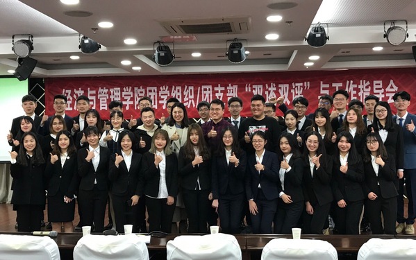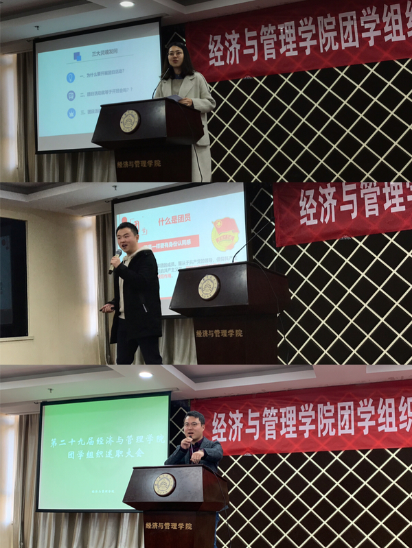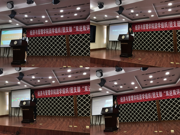 首先,学院团委、学生会、科协、青协等四个团学组织的学生骨干进行了工作述职,并分享了本学期的工作计划。团委副书记余晓妍以“让我留在你身边”为主题,从组织建设、社会实践、思想引领三个维度分享了团委这一年来所取得的成果,并对下一阶段的青马工程、五四评优等工作进行了讲解;学生会主席张秋香阐述了学生会在内部改革、活动开展、权益服务、宣传交流等方面的工作足迹,也对工作中出现的问题进行了总结和反思;科协副主席邱毓婷回顾了组织创新创业类竞赛、开展创新创业类培训等工作的内容,本学期讲继续以建设服务型部门作为工作重点,弘扬“大众创业、万众创新”的时代精神;青协主席李姝萱与大家分享了青协下属部门的珍贵瞬间,汇报了各个志愿服务项目的运营情况,本学期将着力围绕品牌建设、团队内训等开展工作,传播经管学子的爱与温暖。