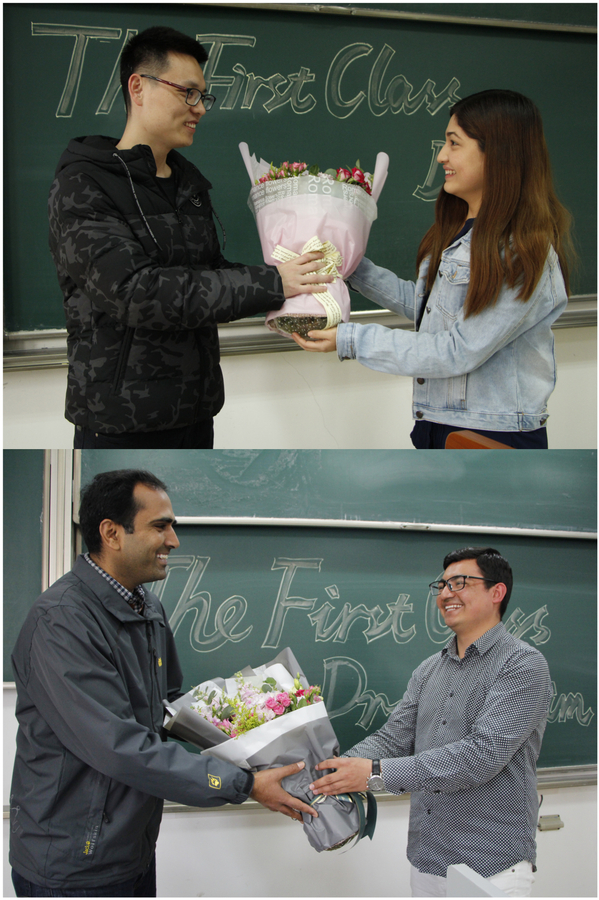 来自五湖四海的近百名留学生们共同见证了这一温馨而庄重的一幕。邓晶、王英分别为留学生们简要介绍了何昌清、HASHIM的学术经历和科研成果,希望同学们在国际化的课堂中学得其乐,学有所获。焦宏图则为两位新教师送上了学院精心准备的“金嗓子喉宝”和“经管定制优盘”,希望两位老师用“金嗓”打造“金课”,用U盘记录师生从游的美好点滴。