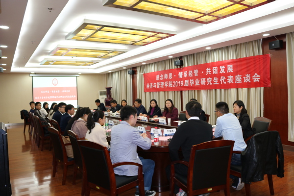 4月4日下午1点,中文成人网 在学院604会议室举办“感念师恩•情系经管•共话发展”2019届毕业研究生代表座谈会。中文成人网 院长周德群、党委书记焦宏图、副院长王英、党委副书记涂志宏、各系系主任、副主任、毕业生辅导员以及钱梦烨等15名应届硕士毕业生出席了本次座谈会。