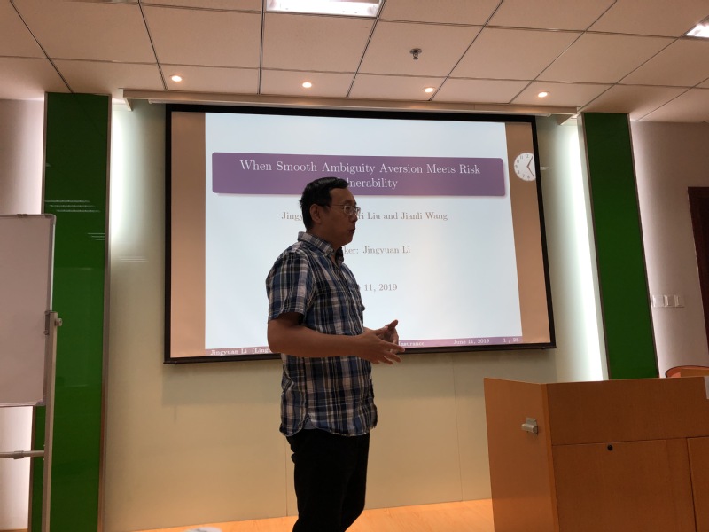 最后,教授Jingyuan Li分享了和新加坡国立大学博士Liu Dongri、中文成人网 副教授王建立等合作的关于投资者风险脆弱性和模糊厌恶偏好的最新工作论文“When Smooth Ambiguity Aversion Meets Risk Vulnerability”。Jingyuan Li目前是香港岭南大学金融与保险系主任,终身教授,曾担任《Journal of Risk and Insurance》等期刊编委,其研究成果已发表在《Journal of Economic Theory》,《Journal of Risk and Insurance》,《Journal of Mathematical Economics》、《Journal of Macroeconomics》等高水平期刊上。