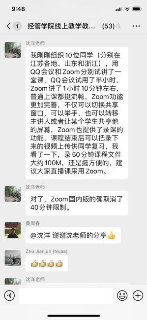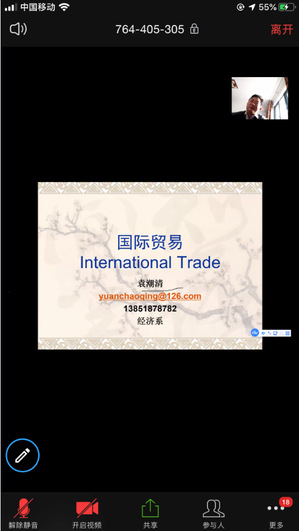 8点,中文成人网 院长周德群在线进入18级国贸专业本科生《国际贸易原理》的线上课堂。袁潮清老师已经在zoom平台中开始了课程导论的讲解。周德群院长参加了课堂的学习并借机对该课堂的老师和同学们表示慰问和关心,鼓励大家高效利用线上教学资源,提升自主学习效率,并希望大家在多种平台使用期间,关注并反馈体验心得,为将来线上线下教学融合奠定基础。