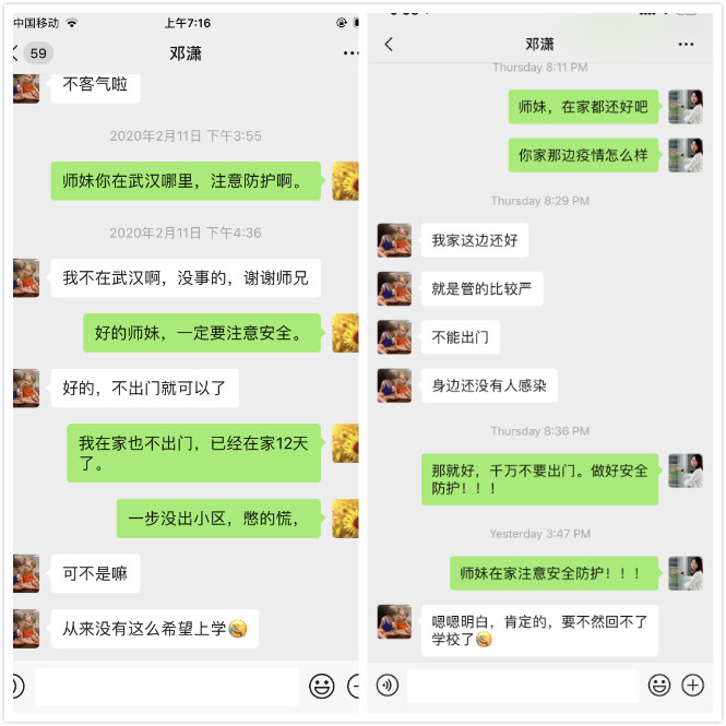 面对这个特殊的寒假,在不能外出和返校的情况下,线上课题组群成为了团队成员交流学习的精神家园。导师徐海燕教授时刻关注、关心着学生们的身体状况和学习情况。在课题组群中,大家会第一时间收到徐海燕老师分享的最新疫情资讯、学校和学院的重要通知、科学防护指南。此外,他们还相互送去节日祝福和暖心问候。“隔离病毒,但不隔离爱”,家住湖北的邓潇同学是团队成员最为关心的对象。疫情爆发后,大家第一时间就与邓潇同学取得联系,表示关心与慰问。此后团队成员一直密切关注她的身体健康情况,了解其生活所需并及时给与帮助。