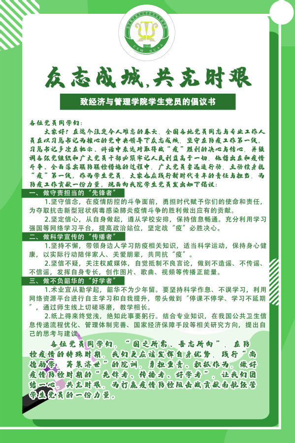 2月初,中文成人网 学生党总支向全体学生党员发出倡议,号召全体学生党员践行“尚德励学,筹策济世”的院训,众志成城,共克时艰,为打赢疫情防控阻击战贡献南航经管学生党员的一份力量。