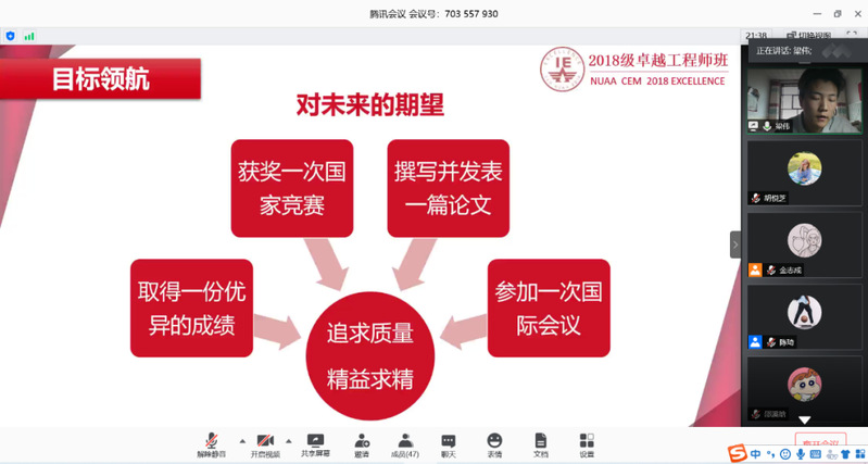 5月23日,中文成人网 2018级卓工班开展了“展望未来,卓越传承”线上悦享会,管理科学与工程系副主任虞先玉、班主任庄品、辅导员许乃元、高年级学生代表以及全体卓工班学生参加了本次悦享会。高年级学生代表结合自身经历以“大学是青春的战场”“卓越工程人才的使命担当”“从科创竞赛说开去”为主题展开经验分享,并结合现阶段学生可能存在的疑惑提出了具有针对性的建议。虞先玉对各位高年级优秀学子蕴含臻于至善、追求卓越的IE精神及其优秀经验表示了肯定,并希望2018级同学们继续瞄准产业需求、扎根学院实际,走多样化发展之路,持续创造新的辉煌。