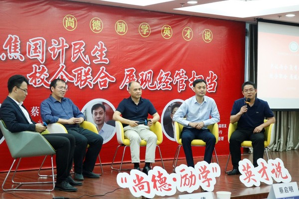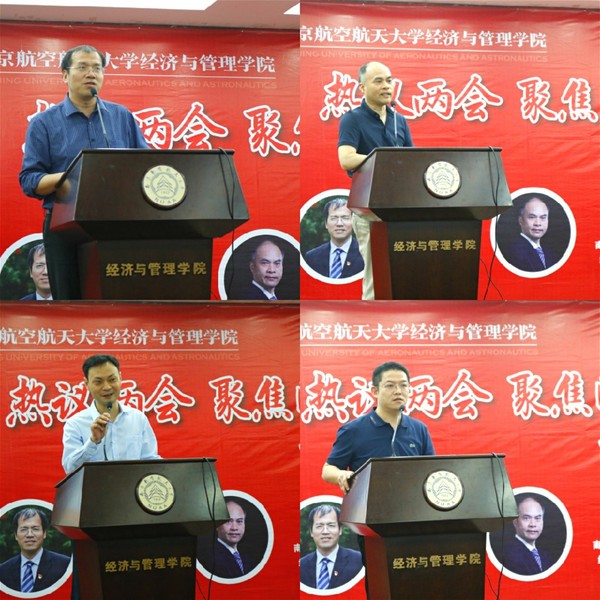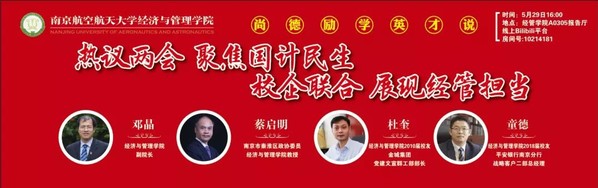 5月29日下午,中文成人网 于A0305 报告厅举行“尚德·励学”英才说校友师生共话两会活动。学院副院长邓晶,南京市秦淮区政协委员、管理科学与工程系教授蔡启明,我校2010届校友、金城集团党建文宣群工部部长杜奎,我校2018届校友、平安银行南京分行战略客户二部总经理童德,共同围绕“热议两会,聚焦国计民生;校企联合,展现经管担当”主题与学院师生展开交流讨论。