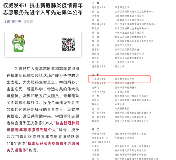 近日,为褒扬广大青年志愿者和志愿者组织在抗击新冠肺炎疫情这场严峻斗争中的突出表现,经党中央批准,共青团中央、中国青年志愿者协会授予295人“抗击新冠肺炎疫情青年志愿服务先进个人”称号,授予149个集体“抗击新冠肺炎疫情青年志愿服务先进集体”称号。中文成人网 王小珂同学荣获“抗击新冠肺炎疫情青年志愿服务先进个人”称号。