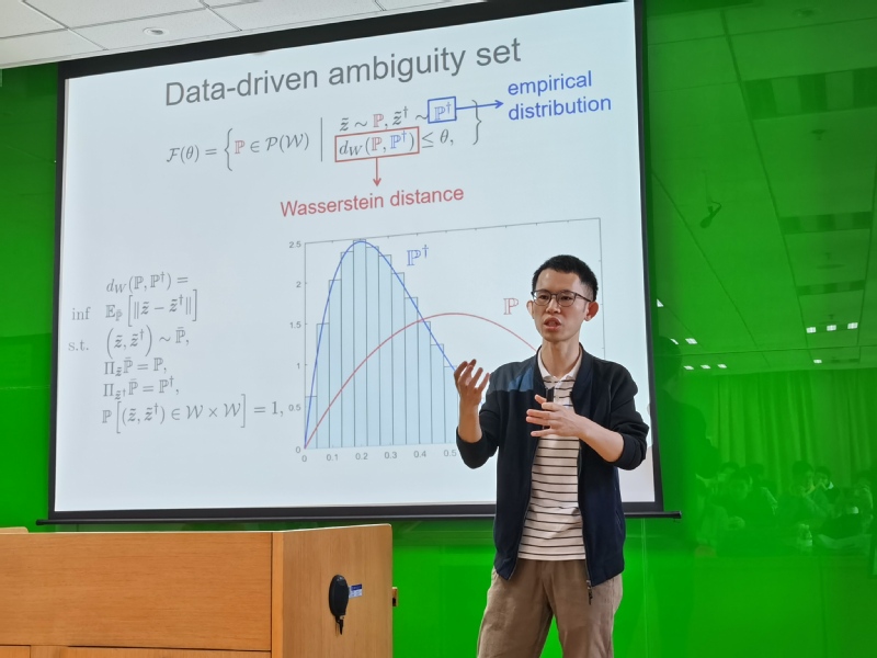 在此次学术交流活动中,章宇首先作了题为“数据驱动的鲁棒车辆路径优化”的报告。报告针对带时间窗的车辆路径问题,考虑不确定旅行时间,通过历史数据生成其经验分布,假设真实但无法观测的分布处于以经验分布为球心的一个Wasserstein球中,并规划最坏分布情况下的鲁棒车辆路径方案,以在给定费用预算前提下,尽量规避迟到风险。为了求解该问题,研究提出精确的分支切割法与变邻域搜索元启发式算法,并探究其加速计算策略。