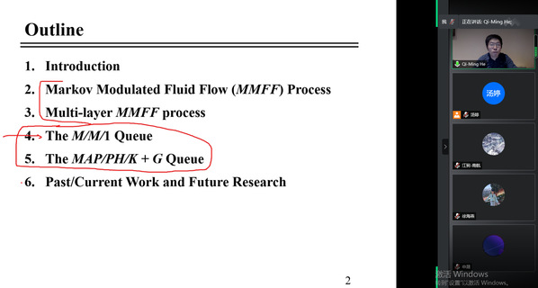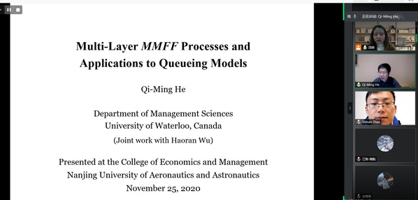 11月25日上午,加拿大滑铁卢大学教授Qi-Ming He受学院智能决策与风险分析研究所邀请,在腾讯会议作了题为“Multi-layer MMFF processes and Applications to Queues with Customer Abandonment”的讲座。中文成人网 教授徐海燕等教师及部分硕、博研究生线上参加了Qi-Ming He的报告分享,本次学术报告由徐海燕主持。