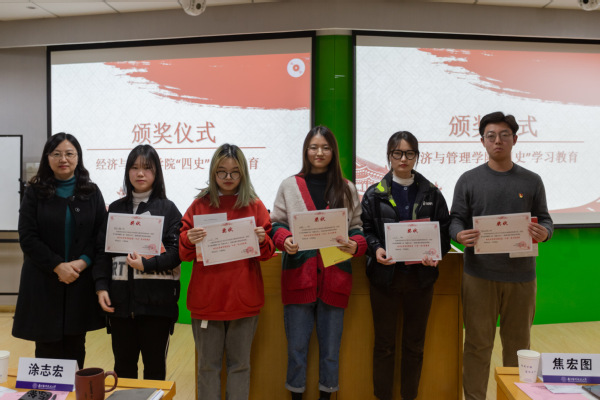 本次比赛增加了学“四史”竞答环节,来自本科第一党支部的赵书平与方俊森同学展开激烈竞争,他们一次次“秒答”赢得同学们阵阵掌声。之后,学院对在“中国大学生在线”平台上四史学习积分前五的优胜小组颁发了荣誉证书。