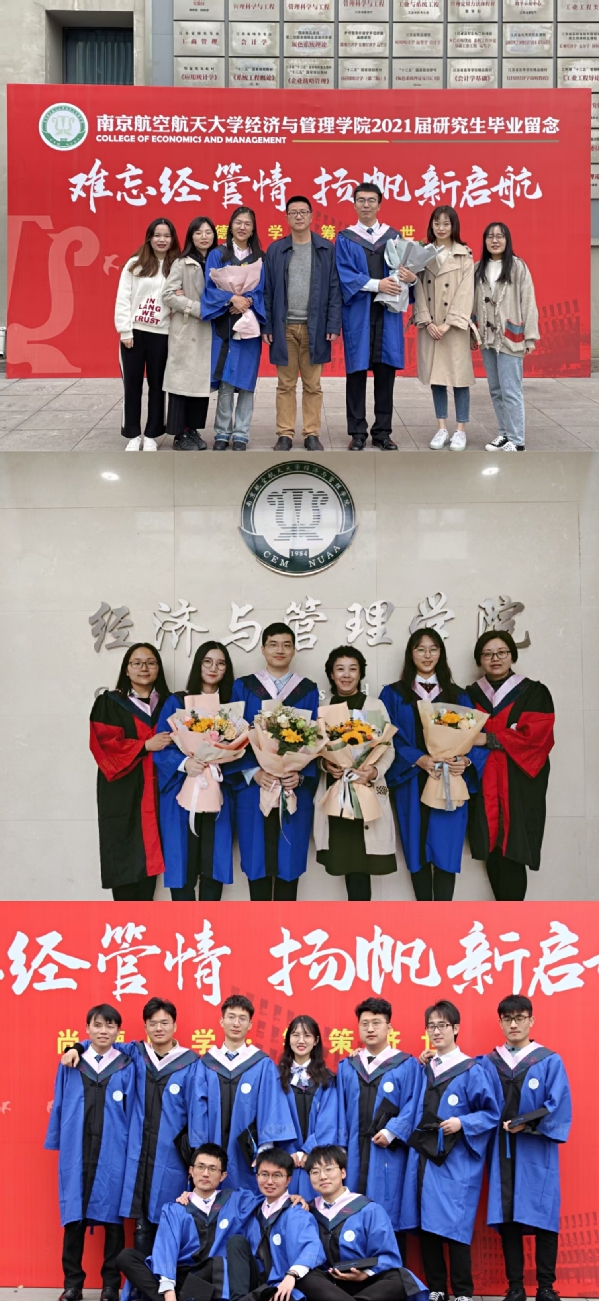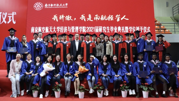 4月7日上午,学院在东区体育馆举行了“我骄傲,我是南航经管人”2021届研究生毕业典礼暨学位授予仪式,4名博士生、106名硕士生、8名留学生依次踏过红毯,走上舞台,5位导师为同学们颁发学位证书并拨穗正冠,完成了人生中的这一重要时刻。学位授予仪式后,同学们与老师们纷纷合影留念。