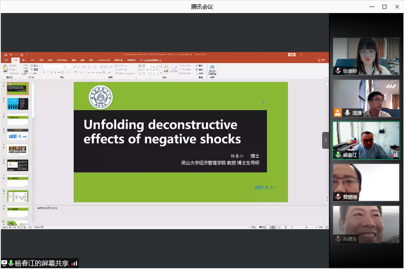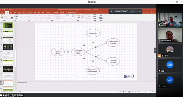 5月17日,燕山大学经济管理学院教授杨春江应中文成人网 人力资源管理研究所和江苏省人力资源发展研究基地的邀请,在线上作了题为“消极震撼事件的影响及机理研究——基于服务业一线员工的调查”的精彩学术报告。本次报告由教授胡恩华主持,年轻教师、博士生和硕士生参加了此次学术报告活动。