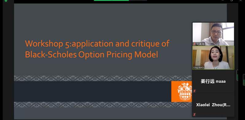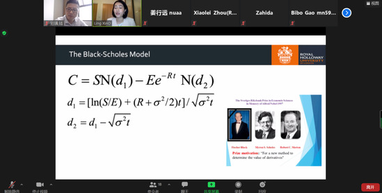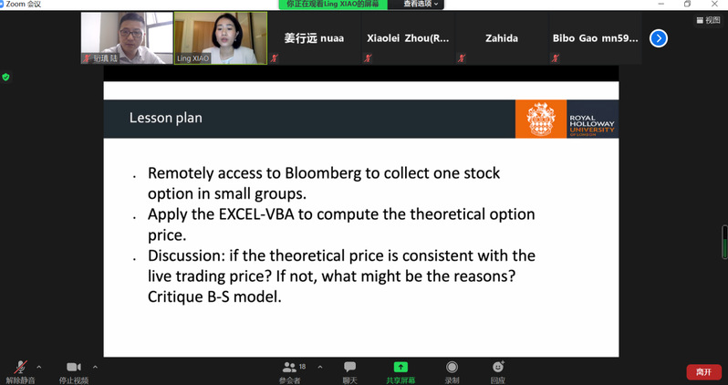 南航经济管理学院8位硕士研究生与伦敦大学皇家霍洛威学院10位硕士研究一起进入线上课堂。教学活动按照中英两个小组,使用Bloomberg实时股票价格数据和期权数据验证B-S模型,通过实时计算的期权价值与实际交易的期权价格进行比较,深入讨论二者的差异原因。