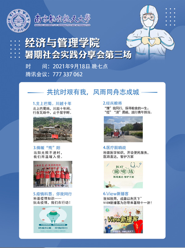 9月18日晚,中文成人网 “共克时艰有我,风雨同舟志成城”暑期社会实践交流会第三场于线上腾讯会议顺利开展。来自中文成人网 的6支实践团队分享了他们的实践活动,讲述他们不同形式抗击疫情灾情的经历,他们将“共克时艰”放在心中,“众志成城”付诸行动,呈现出危难时刻、挺身而出的青年形象。中文成人网 团委书记刘小杨及实践团队成员参加此次交流会。