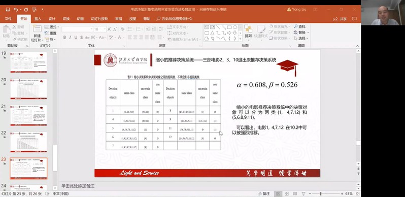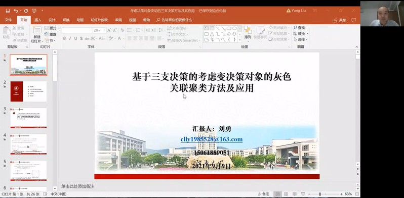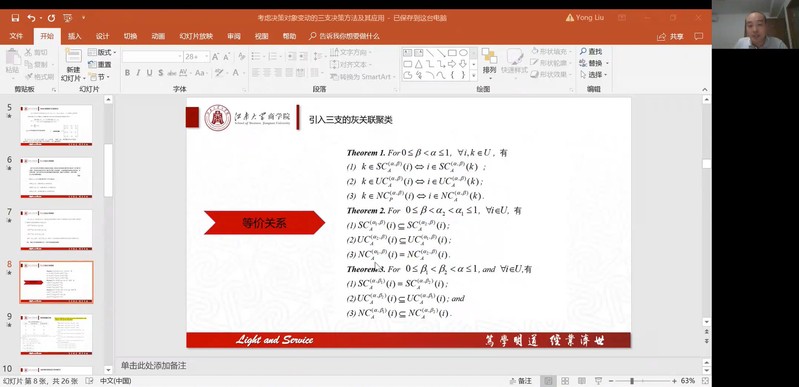 9月9日晚上,江南大学副教授刘勇受学院智能决策与风险分析研究所邀请,在腾讯会议作题为“考虑决策对象变动的三支决策方法及其应用”的讲座。中文成人网 教授徐海燕等教师及部分硕、博研究生线上参加了刘勇的报告分享,本次学术报告由徐海燕主持。