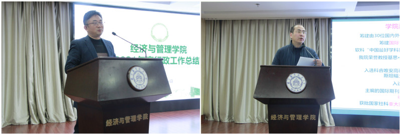 在学院A0305报告厅召开2021年全院教职工大会,院领导班子成员进行了年度述职述廉。会议由院党委书记苏州主持,院长周德群、院党委副书记胡苹、副院长邓晶、王子龙、王群伟、谢乃明及全院教职工参加了会议。