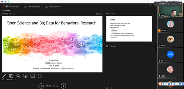 4月8日,新加坡国立大学商学院副教授宋照礼应中文成人网 人力资源管理研究所和江苏省人力资源发展研究基地的邀请,在线上为中文成人网 师生作了题为“Open science and big data for behavioral research”的精彩学术报告。本次报告由教授胡恩华主持,相关教师、博士生和硕士生参加了此次学术报告活动。