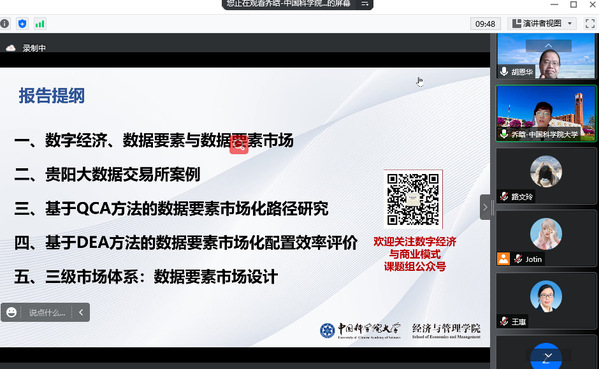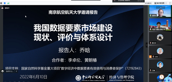 6月10日,中国科学院大学中文成人网 教授乔晗应中文成人网 人力资源管理研究所和江苏省人力资源发展研究基地的邀请,在线上(腾讯会议地址:996560802)为中文成人网 师生作了题为“我国数据要素市场建设现状、评价与体系设计”的精彩学术报告。本次报告由教授胡恩华主持,教师李媛、何昌清、蔡静雯以及博士生和硕士生参加了此次学术报告活动。