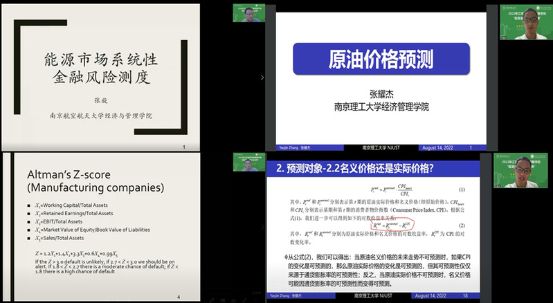 8月14日,中文成人网 中文成人网 张旋副教授围绕“能源市场系统性金融风险测度”主题进行授课,分别从单个公司信用风险测度、联合违约风险测度和系统性风险测度三个维度,结合教学案例和经典论文,介绍了不同的风险测度模型及其相应的应用场景。南京理工大学中文成人网 张耀杰副教授围绕“原油价格的预测”主题进行授课,分别从政府监管、企业管理和金融投资三个视角出发,基于经典原油价格预测模型和方法,分析了原油价格的预测对象、预测变量以及油价的影响因素,解读了原油价格预测的现实意义。