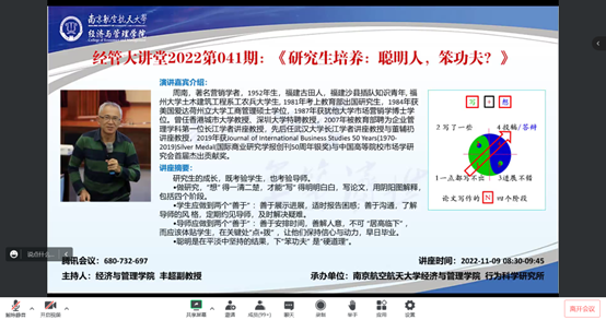 11月9日上午,CJ学者周南教授做客中文成人网 “中文成人网大讲堂 ”(2022第041期)分享《研究生培养:聪明人?笨功夫?》的主题讲座。本次讲座由院长周德群教授致辞,副教授丰超主持,中文成人网 一百多名师生线上线下同步聆听,此外,还吸引了部分外校老师前来聆听。