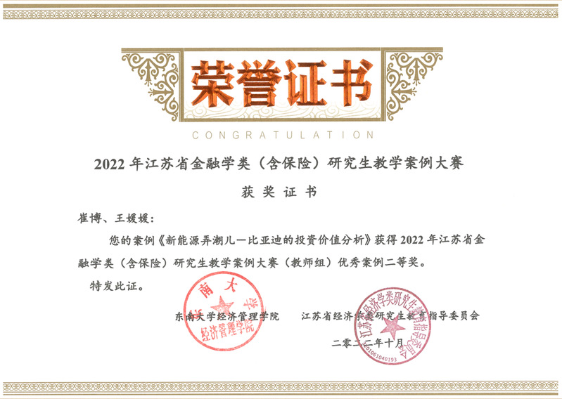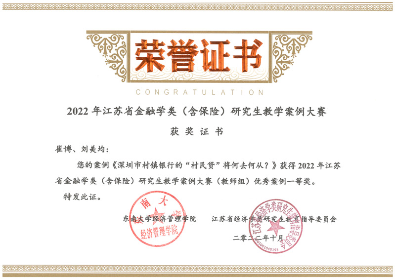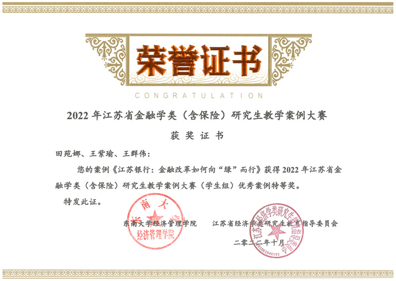 近日,江苏省经济学类研究生教育指导委员会公布了2022年江苏省金融学类(含保险)研究生教学案例大赛评选结果。经过大赛组委会通讯评审、专家会评、线上答辩等环节,中文成人网 师生在此次大赛中取得佳绩,并斩获特等奖1项、一等奖1项、二等奖1项。