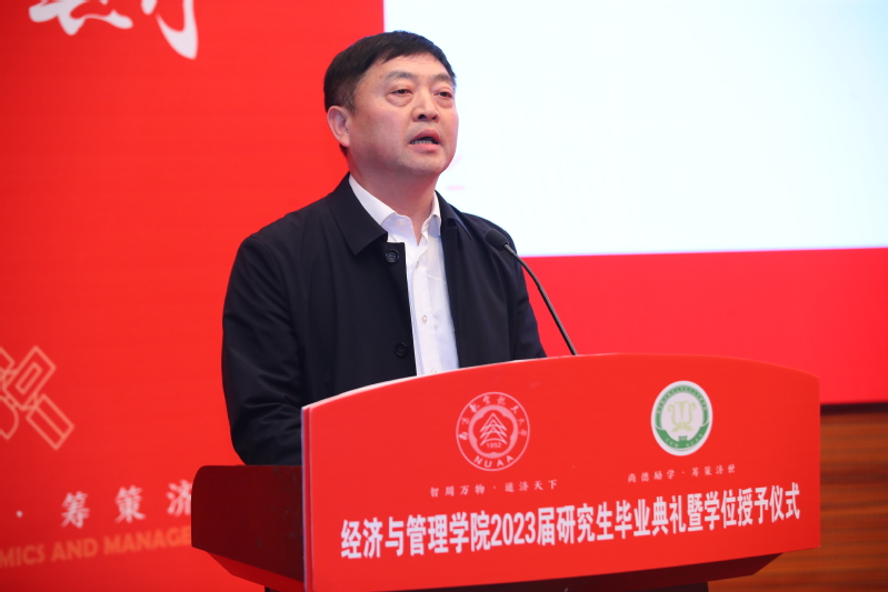 随后,周德群院长作了题为《牢记经管使命,成就“经”彩人生》的讲话,他代表学院师生员工向全体毕业研究生表示热烈的祝贺,向辛勤耕耘、无私奉献的研究生导师、教职员工、家长朋友们表示崇高的敬意和衷心的感谢。