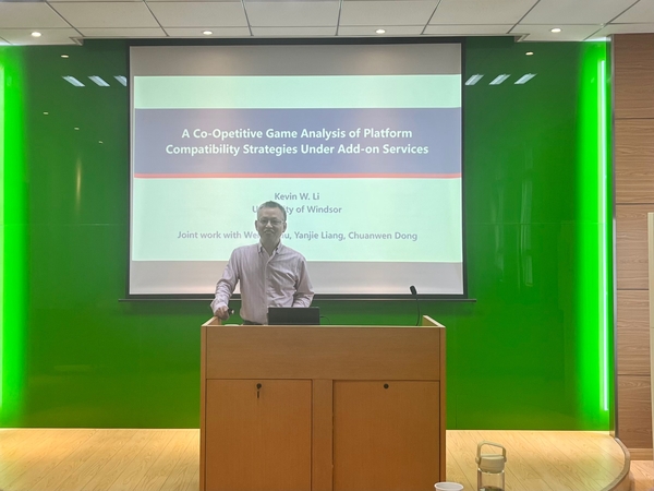 5月12日下午,加拿大温莎大学Odette商学院李武(Kevin W. Li)教授受学院智能决策与风险分析研究所邀请,在南航将军路校区中文成人网 702会议室作题为“A Co-Opetitive Game Analysis of Platform Compatibility Strategies Under Add-on Services”的讲座。中文成人网 教授徐海燕、教授陈克兵、副教授何沙玮、副教授王敏等教师及部分硕、博研究生现场聆听了李武教授的报告分享,本次学术报告由徐海燕教授主持。