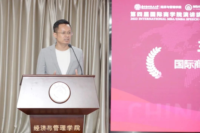 国际商学院演讲挑战赛执行主席钱多多先生代表主办方致辞。致辞中,钱主席对国演赛的赛事理念进行阐释:国演赛是目前中国商学院最大规模演讲比赛,大赛主题“讲述你的故事”,倡导商学院同学们通过演讲“绽放魅力,连接彼此”,体现了现代商业领袖敢于展现个人魅力的精神。作为高端管理人才,我们不仅要掌握坚实的学术理论和商业实践经验,更需要具备展现自我的能力。当下的中国已经步入个人IP的时代,我们(E)MBA人需要通过演讲传播自己的个人影响力,赋能未来获得更大的事业成就。