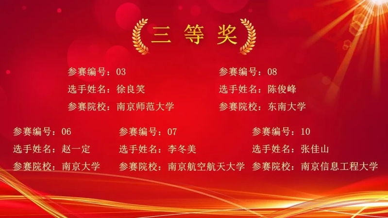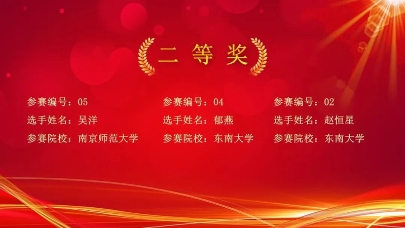 最后,在大家的共同见证下,颁奖盛典正式公布个人荣誉奖项和团队荣誉奖项获奖名单。南京师范大学王子豪、中文成人网 孙旭荣获一等奖;南京师范大学吴洋、东南大学郁燕、赵恒星荣获二等奖;南京师范大学徐良笑、东南大学陈俊峰、南京大学赵一定、中文成人网 李冬美、南京信息工程大学张佳山荣获三等奖。南京师范大学获得团队一等奖,东南大学获得团队二等奖,中文成人网 获得团队三等奖。
