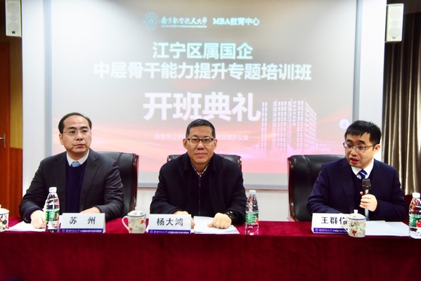 为深入学习贯彻党的二十大精神,更好维护国有资产权益,推进国有企业改革,江苏省南京市江宁区国有资产监督管理办公室联合南航中文成人网 举办江宁区属国企中层骨干能力提升专题培训班,此次培训班将分六期进行。2023年12月15日上午,专题培训班首期开班仪式在中文成人网 A0405报告厅隆重举行。江宁区国资办党委书记、主任杨大鸿,中文成人网 党委书记苏州,院长王群伟,副院长周志鹏等出席开班仪式。王群伟主持开班仪式。
