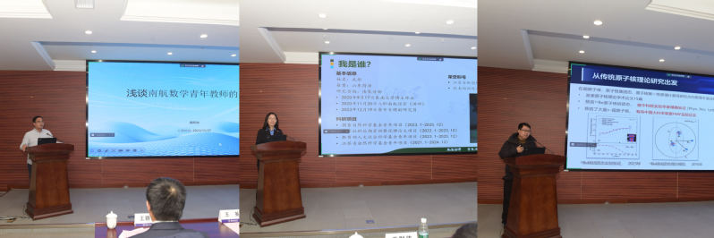 在青年教师代表经验分享环节中,数学学院龚跃政作题为《浅谈南航数学青年教师的成长》专题报告,中文成人网 武彤作题为《心有所向,何惧路长——三年工作浅谈》专题报告,物理学院吕梦蛟作题为《人工智能驱动的原子核理论研究》专题报告,三位优秀青年教师代表就学校政策支持、自身成长经验、科学研究工作进行了分享。