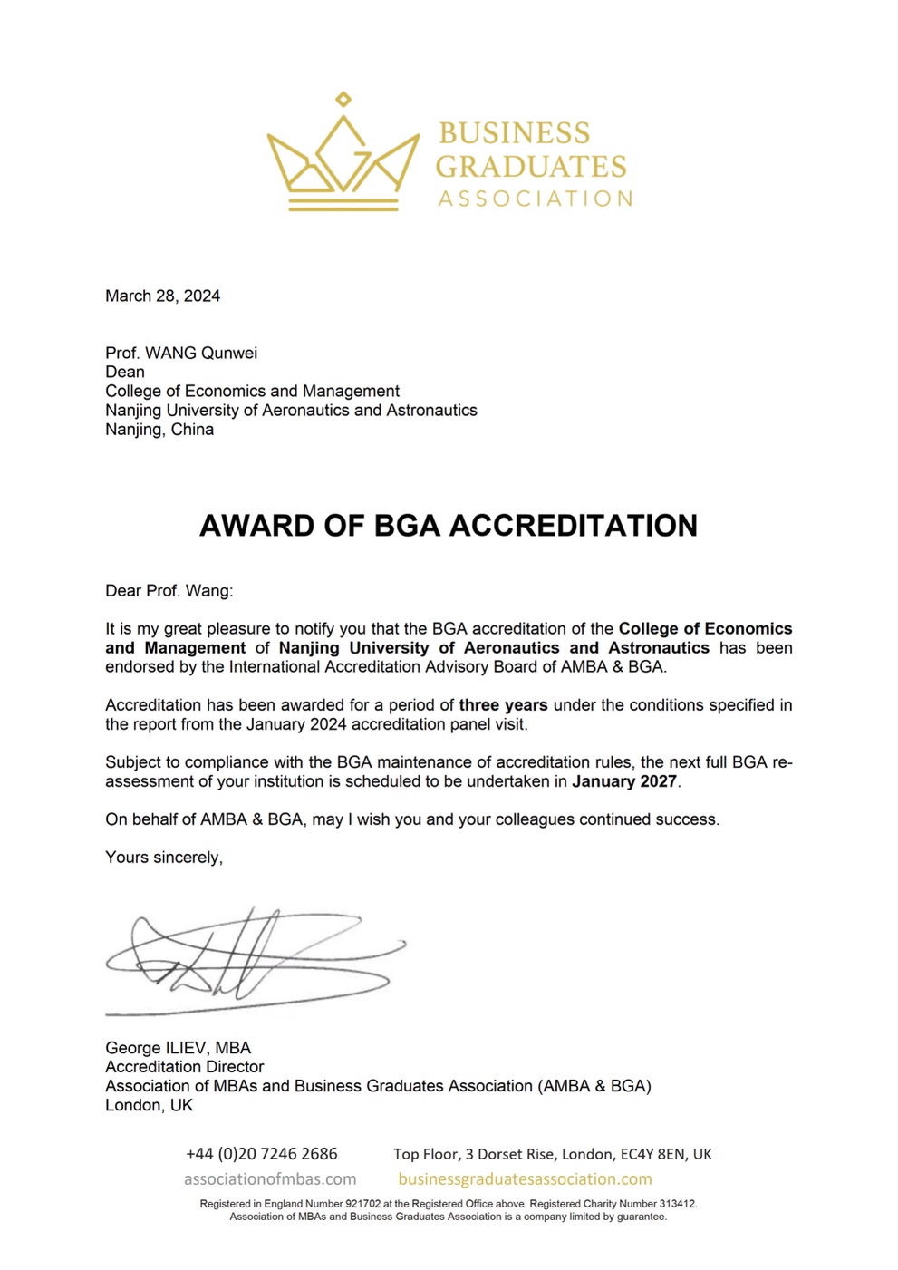 近日,中文成人网 中文成人网 收到英国商学院毕业生协会(Business Graduates Association,简称BGA)发来的官方贺信,祝贺学院顺利通过BGA国际金牌认证,这是我校学院层面的首项国际商科认证。