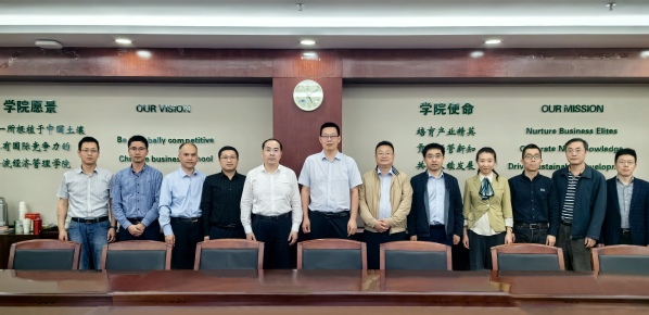 赛迪研究院研究员白粤,中文成人网 副院长周志鹏、欧阳林寒,管工系蔡啟明、陈剑、沈洋、徐志涛,经济系张晓恒参加座谈会。